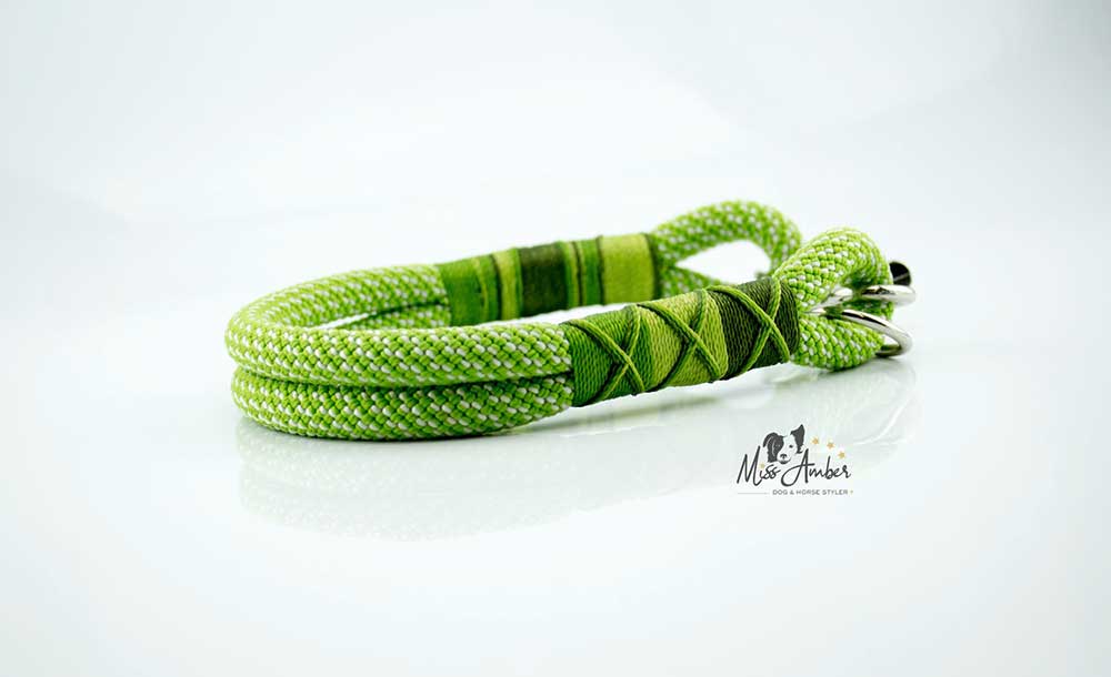 Wenn das keine Frühlingsgefühle weckt! Damit auch das Outfit von Düse stimmig ist, gibt es natürlich passend zum Brustgeschirr ein Halsband! Aus dem schicken Premiumseil „Meadow“ in Grüntönen, umwickelt in Olive-Noten.