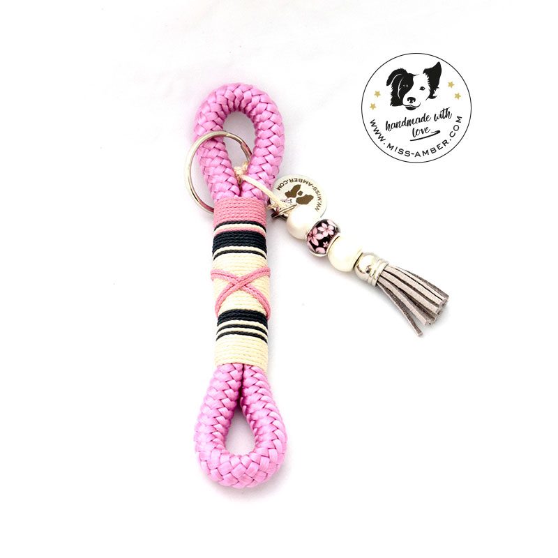 Der farbenfrohe Schlüsselanhänger macht die Schlüsselsuche um einiges einfacher. In Handarbeit passend zu Halsband und Leine gefertigt.